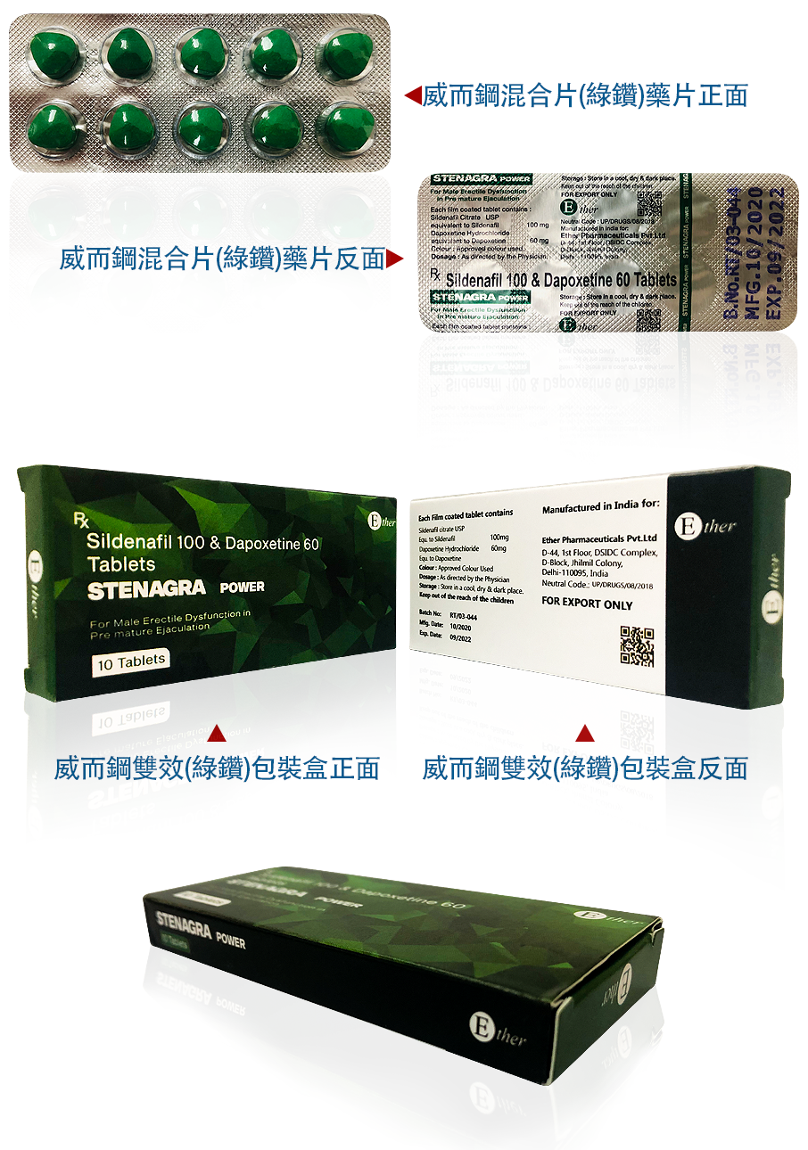 雙效Stenagra Power綠鑽是一種兩強的成分是60mg達泊西汀和100mg西地那非的混合成份,能同時改善勃起障礙和早洩。對於許多男人,勃起功能障礙、早洩攜起手來。這可能會導致很多困難,每一顆皆採取兩種不同的藥片。