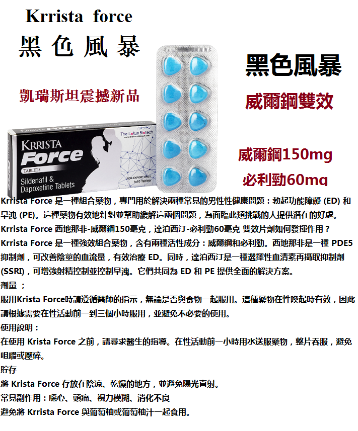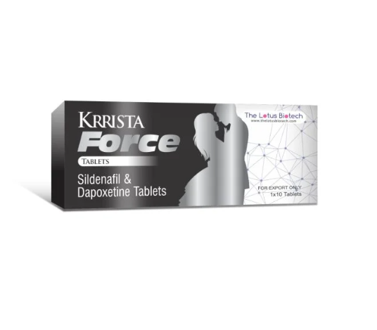 Krrista Force 是一種複方性藥丸,含有兩種活性鹽:西地那非和達泊西汀。西地那非有助於改善陰莖的血流量,有助於治療勃起功能障礙,而達泊西汀則用於解決早洩問題,從而提高性能力和滿意度
