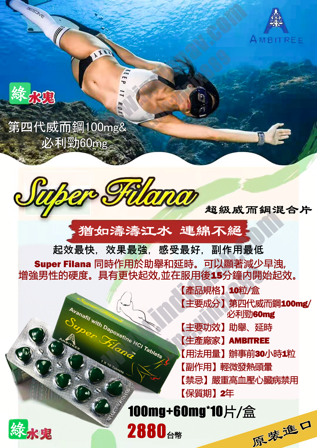 阿伐那非雙效super filana,別名“綠水鬼”,它是由第四代助勃藥物Avanafil(阿伐那非)與延時藥物dapoxetine(達泊西汀)通過特殊的藥物合成工藝制造而成,此款商品最大特點~無副作用!!!其他雙效片可能會說,副作用低、基本無副作用;但阿伐那非雙效那你可以完全放心,零副作用。像頭暈、鼻塞、藍視等情況,完全沒有!身體最多有類似喝酒後熱乎乎的感覺。助勃起效快,助勃平均只需15分鍾,達到藥效峰值。(因同時含必利勁,要想達到好的延時效果還是得提前兩小時服用)不受酒精,飲食影響,傳統“偉哥”,飽腹或飲酒後服用,可能會導致無效,阿伐那非雙效片改善了這一弊端,任何時候,都完美發揮, 唯一缺點:價格小貴。